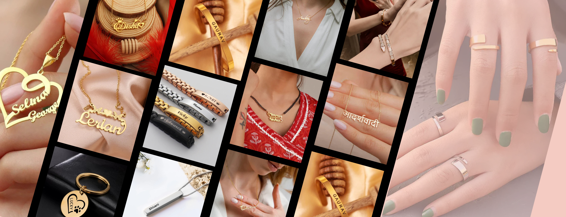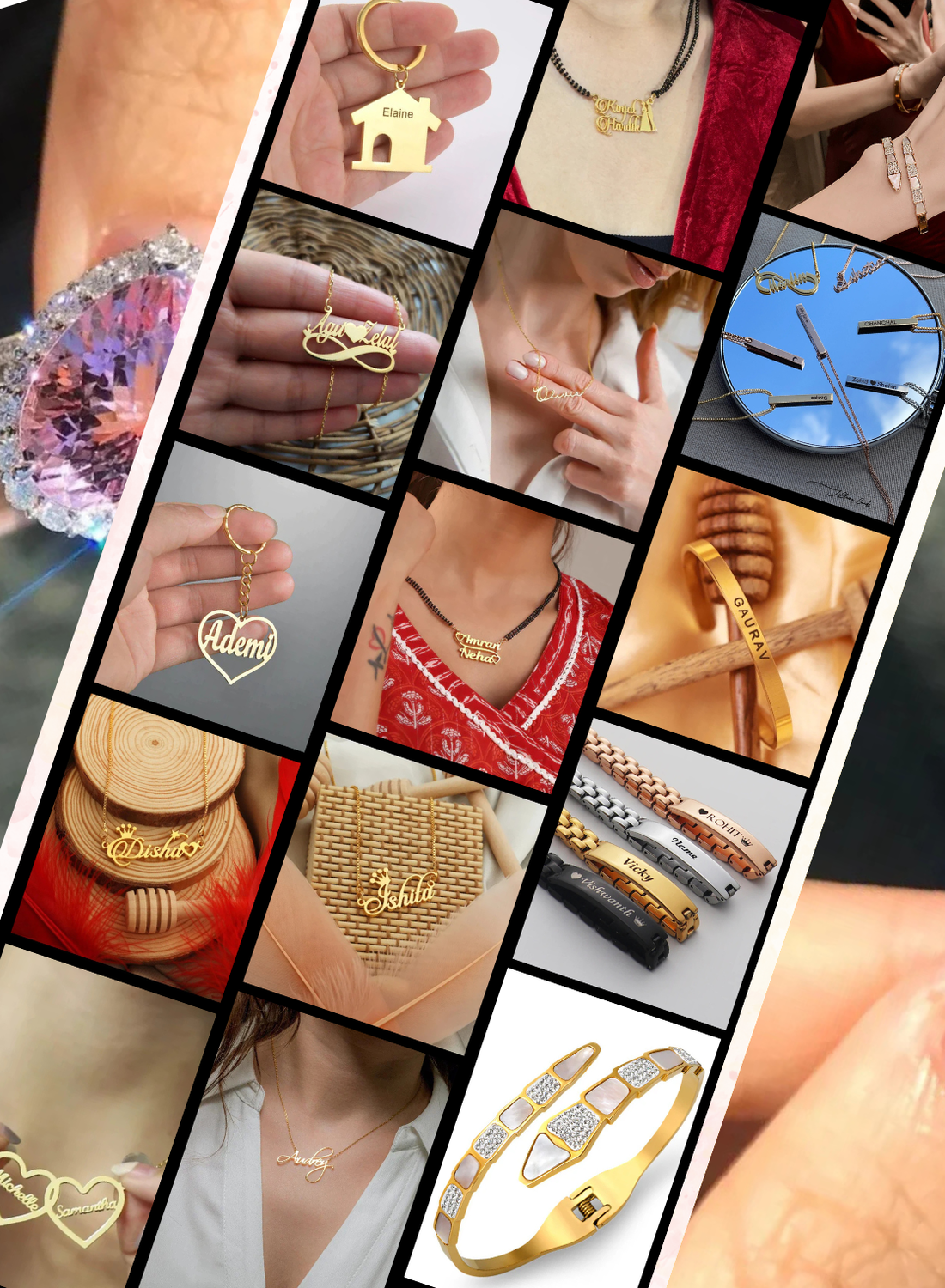 We specialize in customized jewelry, including single name necklaces, couple name necklaces, rings, bracelets, keychains, and 3D bar jewelry. Each piece is crafted with care to create unique, meaningful gifts.